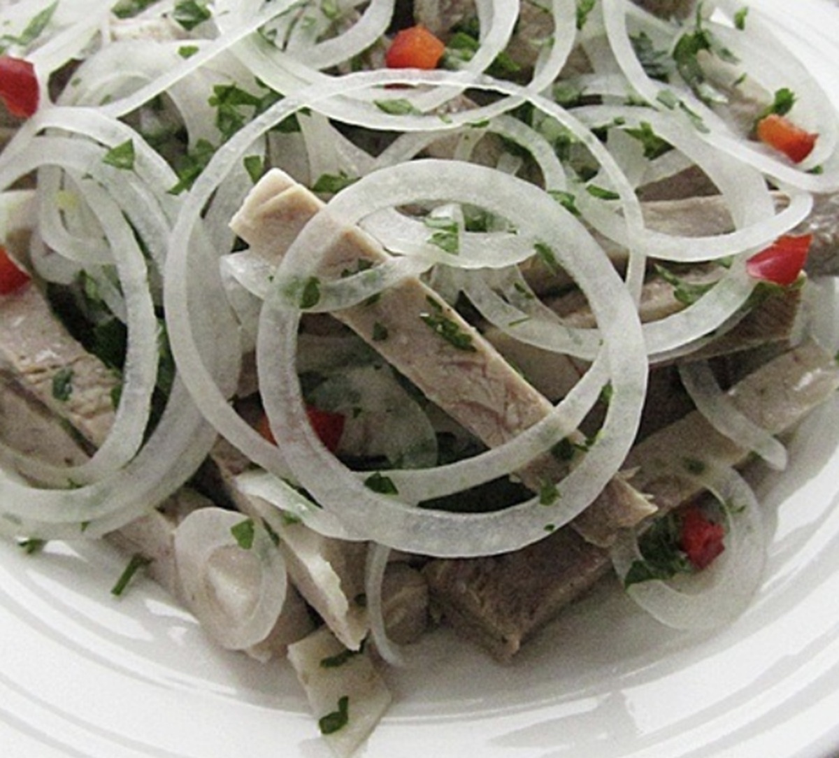 Jāņem vērā fakts, ka gaļa tiks marinēta arī etiķa mērcē, un ir zināms, ka tā mīkstina gaļu. Iesaku ņemt liemeņa pleca daļu. Tā ir ideāli piemērota šiem salātiem, jo pēc pagatavošanas tā paliek maiga un vienlaikus labi saglabā formu. Atdzesējiet gaļu buljonā.