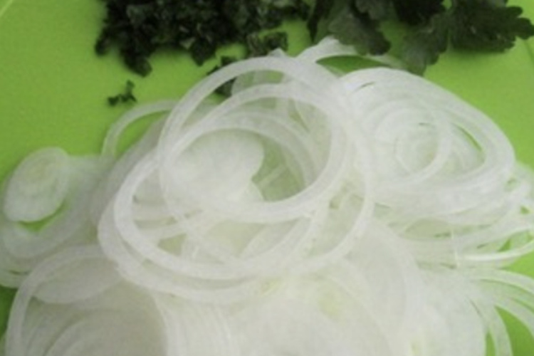 Balto salātu sīpolu sagrieziet plānos gredzenos, izmantojot smalcinātāju. Sasmalciniet pētersīļus un uzmanīgi sajauciet ar sīpolu.