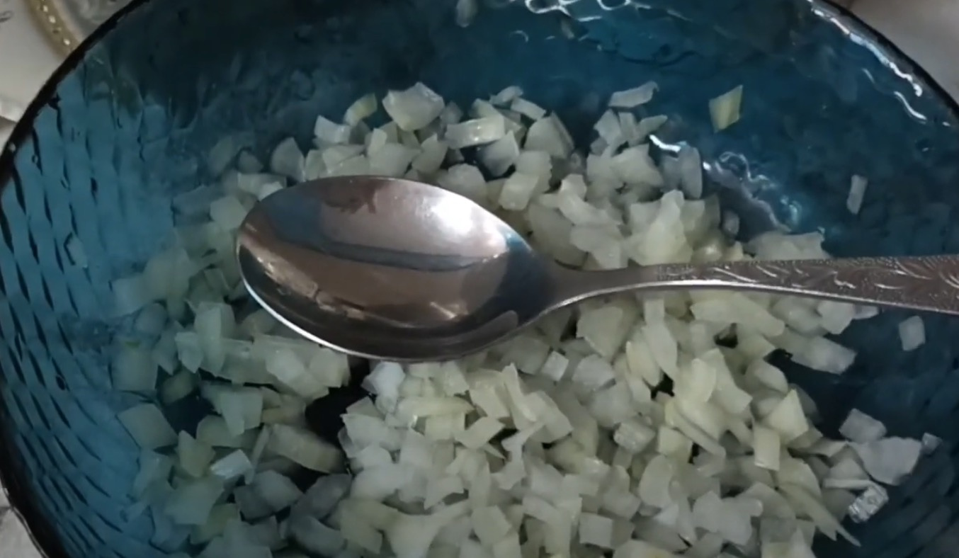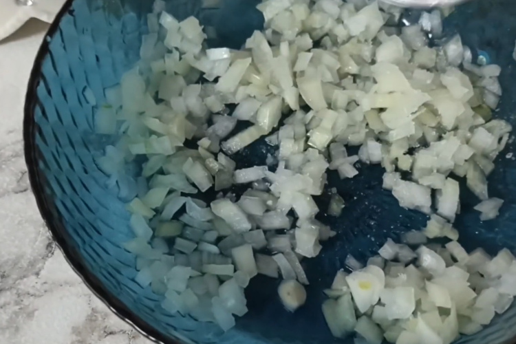 1. Sagriez sīpolu, ieber caurdurī un aplej ar verdošu ūdeni uz 30 sekundēm. Pēc tam liec bļodā.