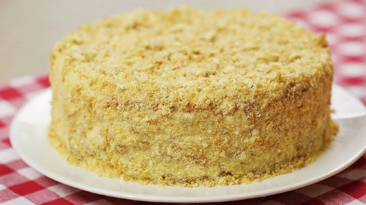 Sasmalcini atlikušos cepumus smalkās drupačās ar blenderi vai mīklas rulli. Apkaisi kūkas virspusi un malas. Ievieto Napoleona kūku ledusskapī bez cepšanas vismaz uz 2 stundām vai vēlams uz nakti. Tas ļaus tam kļūt maigam un gardam.
