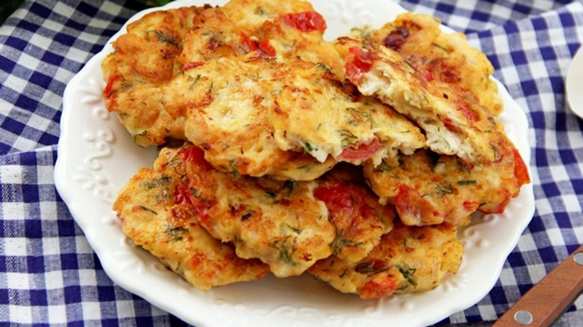 Lielā bļodā sajauciet smalki sagrieztu vistas fileju, sasmalcinātus tomātus, papriku, sasmalcinātus garšaugus, olas, miltus, rīvētu sieru, sāli un piparus.