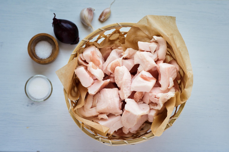 Noņemiet cūkgaļas taukus no ādas un sagrieziet plānās šķēlēs. Sajauciet ar marinādi un rūpīgi samaisiet. Izklājiet vairākas kārtas pārtikas plēves, pievienojiet cūkgaļas taukus un cieši satiniet rullī. Sadurstiet ar zobu bakstāmo, lai izlaistu gaisu, sasieniet galus un novietojiet zem smaga svara ledusskapī uz nakti.