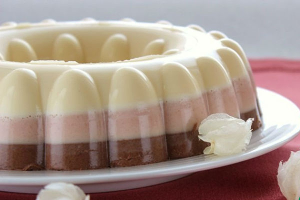Deserts sastāvēs no trim kārtām. Pagatavošana: Vispirms želatīnu pārlej ar aukstu vārītu ūdeni, pēc tam pagaida, līdz tas uzbriest. Pēc tam želatīna maisījumu ievietojiet dubultā katlā un karsējiet, līdz granulas ir pilnībā izšķīdušas, bet neuzkarsējiet līdz vārīšanās temperatūrai.