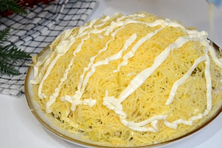 Nomizotus, vārītus kartupeļus ar mizu sarīvējiet uz rupjas rīves un novietojiet uz lēzenas šķīvja. Stingri piespiediet un viegli apsmērējiet ar majonēzi.