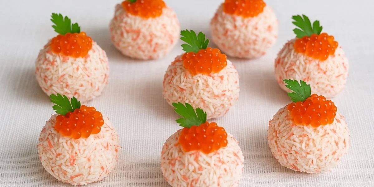 No maisījuma izveidojiet glītas bumbiņas. Apviļājiet bumbiņas sarīvētajās krabju nūjiņās. Ar karoti katrā bumbiņā izveidojiet nelielu iedobumu un ievietojiet tajā ikrus.