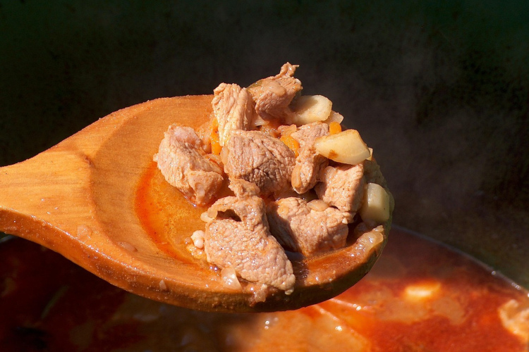 Kad sīpols kļūst zeltains, pievieno divas ēdamkarotes tomātu pastas. Kad katla saturs ir pilnībā apcepts un kļuvis sarkans, pievieno pusotru līdz divus litrus ūdens un visu uzvāra.