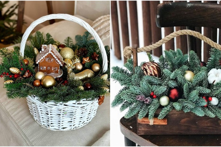 Egļu grozi ir vēl viena skaista un viegli izgatavojama Ziemassvētku dekoru ideja. Lai tos izveidotu, nekas īpašs nav nepieciešams — tikai klūgu grozs un sulīgi egļu zari, kas radīs trīsdimensiju kompozīciju. Iekšpusē varat ievietot arī eglīšu rotājumus, lielus un mazus čiekurus un ogu ķekarus, piemēram, pīlādžu ogas.