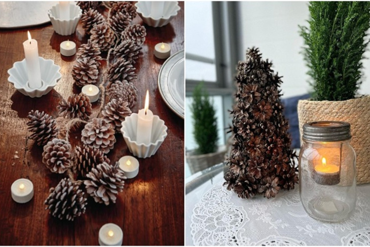 Nevēlaties ķēpāties ar sarežģītiem izkārtojumiem? Tad iesakām atstāt dzīvokli mierā un dekorēt tikai svētku galdu. Čiekuri ir lieliski piemēroti šim nolūkam. Ar tiem var darīt jebko: piemēram, ievietot tos augstā vāzē, kas sajaukta ar vati, lai imitētu sniegu, vai izkārtot tos ar egļu zariem uz plakanas šķīvja.