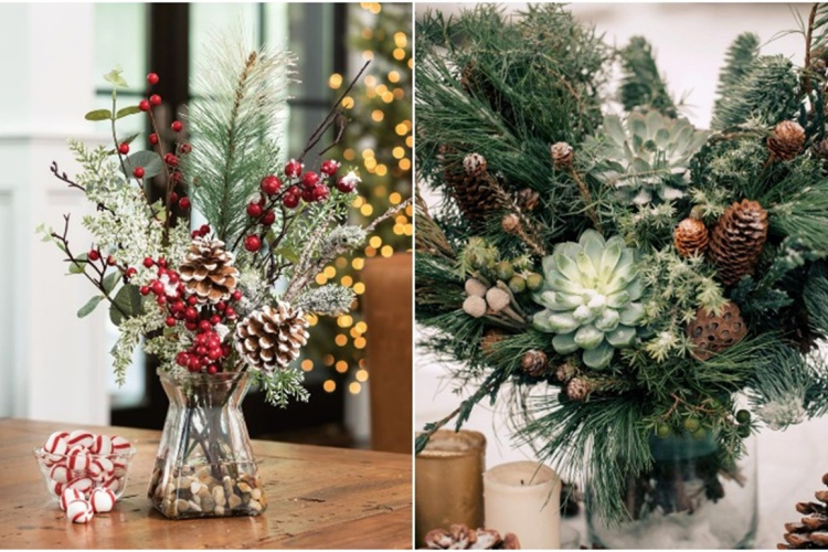 Šeit nav stingru ierobežojumu — vāzi var piepildīt ar visu, kas jums patīk, ja vien tā ir pietiekami ietilpīga. Egļu zari, čiekuri, kaltēti ziedi — kopā tie izskatās ļoti eleganti un oriģināli. Šai kompozīcijai nav nepieciešami nekādi rotājumi — tā izskatās pašpietiekama. Vienīgais, ko varētu pievienot, ir neliela ar baterijām darbināma vītne.