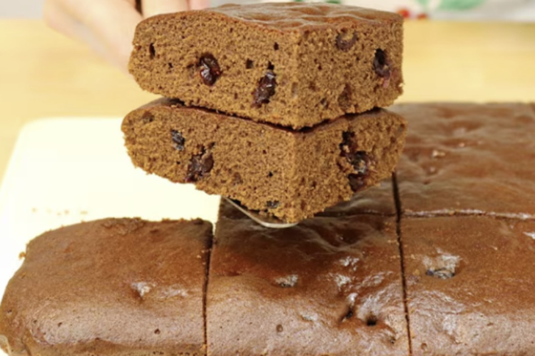 Gatavo mīklu ielejiet ieziestā pannā un cepiet iepriekš uzkarsētā cepeškrāsnī apmēram 40–50 minūtes. Pārliecinieties, ka kūka ir uzrūgusi un zeltaini brūna. Pēc cepšanas ļaujiet atdzist un sagrieziet porcijās. Ja vēlaties, varat pārkaisīt ar pūdercukuru vai pārliet ar izkausētu šokolādi.