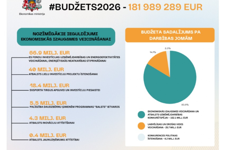 4. decembrī Saeima otrajā un galīgajā lasījumā apstiprināja 2026. gada valsts budžetu. Ekonomikas ministrijas (EM) budžetā noteikti izdevumi 182 milj. eiro apmērā, tostarp 115,1 milj. eiro valsts pamatfunkciju nodrošināšanai un 66,9 milj. eiro ārvalstu palīdzības projektu īstenošanai.