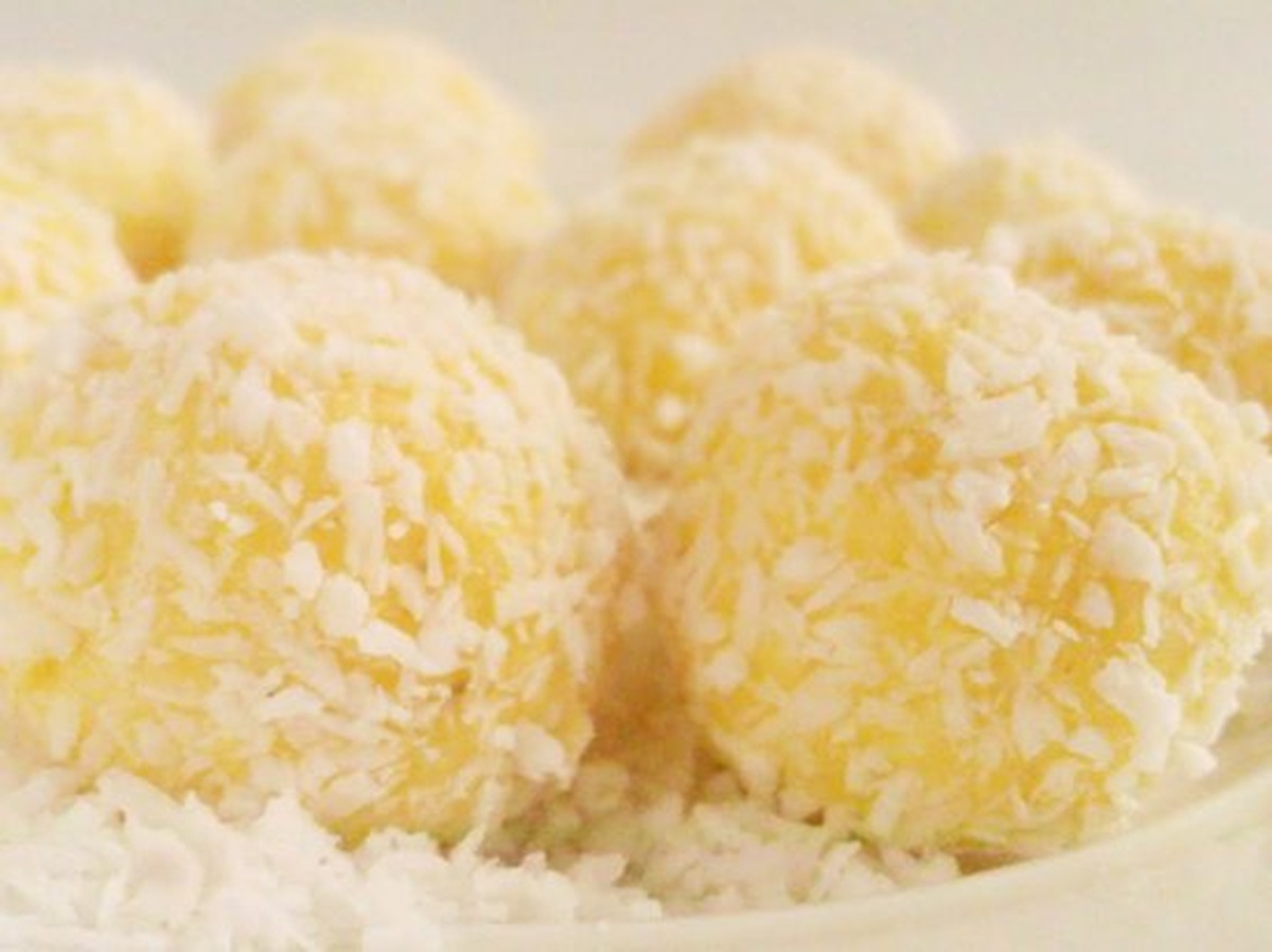 Tagad varat veidot konfektes. Bet vispirms mums būs jāieber nedaudz kokosriekstu skaidiņu citā bļodā un jāsagatavo piemērots trauks gatavo konfekšu uzglabāšanai.