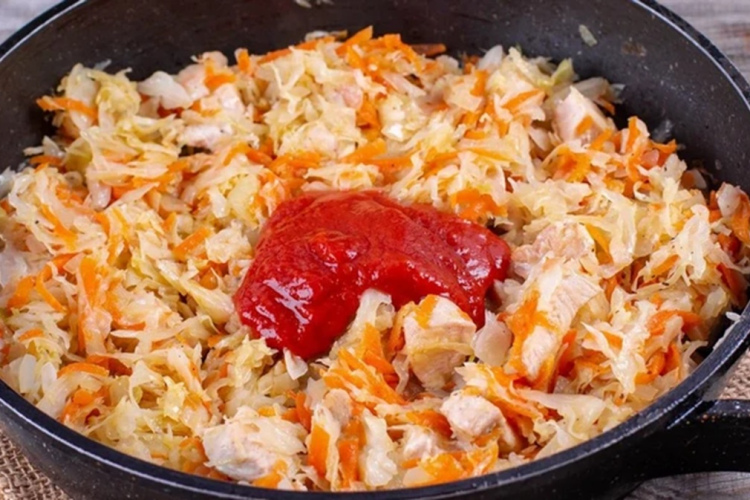 Kad kāposti ir nedaudz sakrituši un kļuvuši elastīgāki, ir laiks pievienot mērces sastāvdaļas. Pannā liek tomātu pastu, sāli, piparus, cukuru un lauru lapu. Visam pāri pārlej nedaudz ūdens (aptuveni 70 mililitrus) un vēlreiz rūpīgi samaisa.