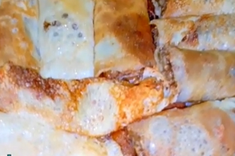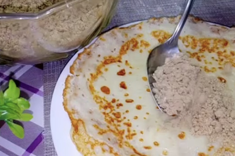 Kamēr pankūkas cepas, sagatavo pildījumu – halvu sasmalcina ar nazi vai vienkārši saspaida ar dakšiņu līdz smalkām druskām. Uz katras gatavās pankūkas vienmērīgi izklāj pildījumu un uzmanīgi sarullē to rullītī vai saloka citā sev tīkamā formā.