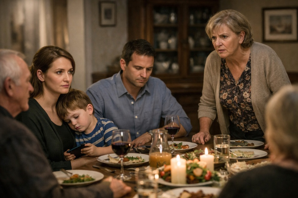 Viesi sēdēja neziņā, kā rīkoties. Tā ir tā nepatīkamā sajūta, kad personīgu nesaskaņu dēļ visiem jājūtas neērti. Vīratēvs Artūrs klusējot skatījās uz galdu, un kāda radiniece mēģināja mainīt tēmu, pajautājot pēc sāls trauciņa. Svētku noskaņa bija zudusi, un Katrīna saprata, ka daudzi klātesošie viņu tagad uzskata par situācijas vaininieci, lai gan viņa tikai vēlējās pasargāt savu un bērna mieru.