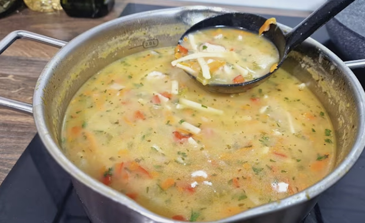Kad dārzeņi ir gatavi, tiem pieber divas ēdamkarotes miltu un viegli apcep, nepārtraukti maisot. Tas ir svarīgs brīdis, jo milti palīdzēs zupai iegūt patīkamu, krēmīgu konsistenci. Pēc tam katlā pakāpeniski lej iepriekš sagatavoto vistas buljonu. Jāmaisa rūpīgi, lai neizveidotos miltu kunkuļi un šķidrums būtu viendabīgs. Šajā posmā pievieno arī melnos piparus, kurkumu un sāli, ļaujot visam uzvārīties.