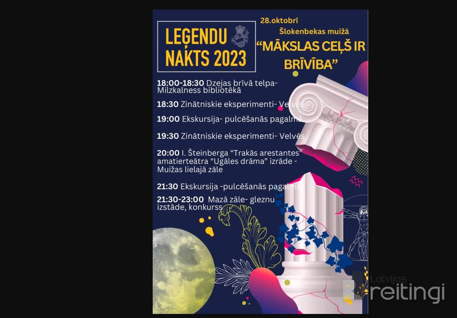 Šlokenbekas muižā Leģendu nakts 2023 pasākumi noritēs ar saukli "Mākslas ceļš ir brīvība". 28.oktobrī no pulksten 18:00 Dzejas brīvās telpas atmosfēru aicinās baudīt Milzkalnes bibliotēka. Pulksten 18:30 un 19:30 muižas velvēs būs piedzīvojami zinātniskie eksperimenti, bet pulksten 19:00 un 21:30 – varēs baudīt ekskursijas muižā.