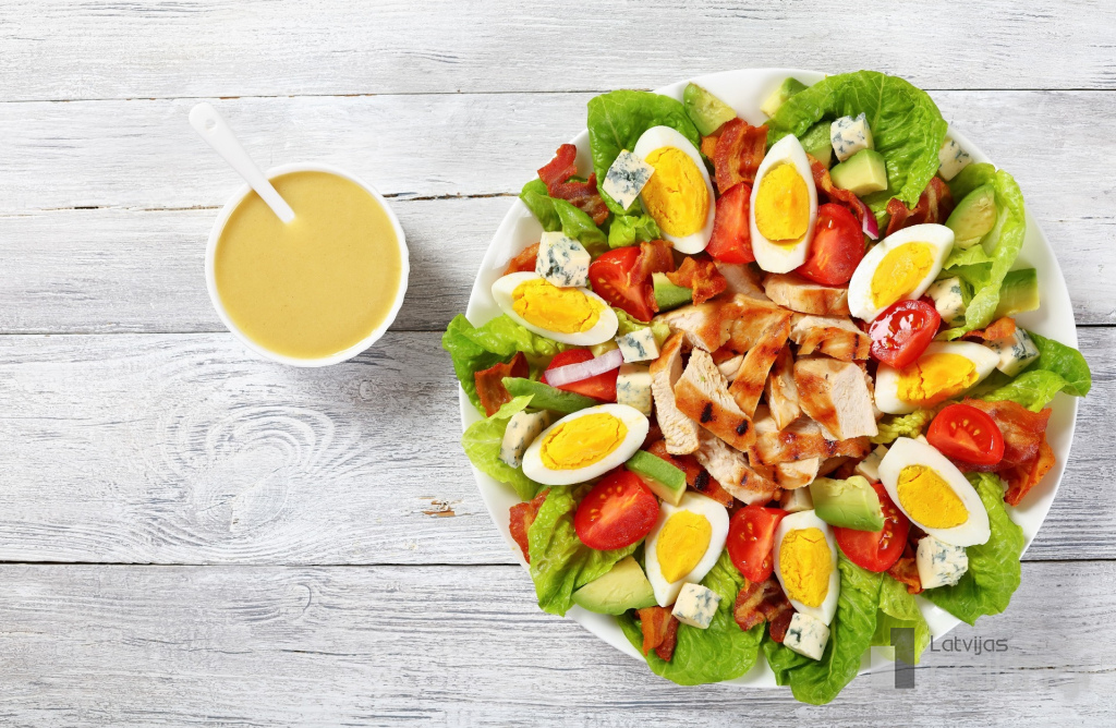Uz liela šķīvja kārto salātus, tomātus, avokado, tītara strēmelītes un olas, visu pārlejot ar gardo mērci un pārkaisot ar kressalātiem.