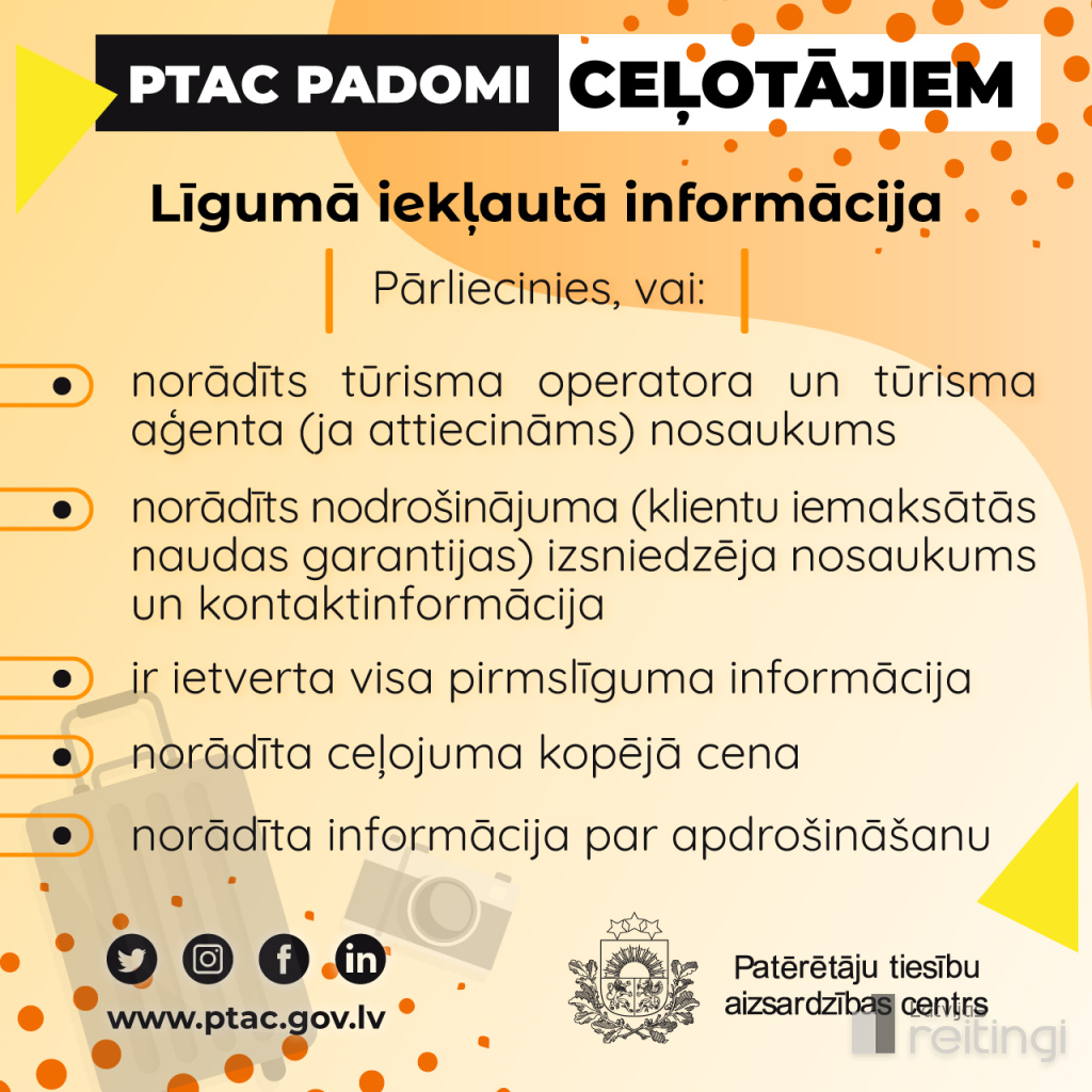 Svarīgi! Saņemot pirmslīguma informāciju par kompleksu tūrisma pakalpojumu (visu būtisko informāciju par konkrēto ceļojumu) un līgumu, pievērsiet uzmanību, vai tajā ir iekļauta nepieciešamā informācija:
