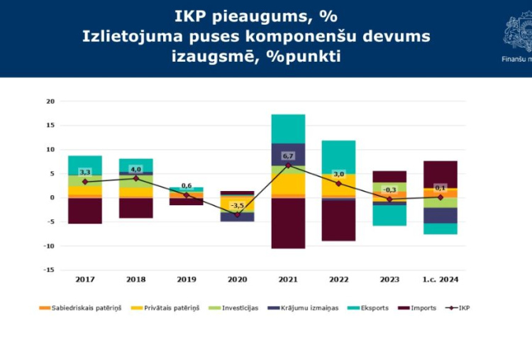 Ekonomiskā situācija Latvijas ārējos tirgos šogad pakāpeniski sāk uzlaboties. Lai gan eirozonai un Eiropas Savienībai prognozētie izaugsmes tempi šim gadam joprojām ir vēsturiski zemā līmenī, tie tomēr ir divas reizes straujāki nekā 2023. gadā, un pēdējos mēnešos ir vērojama arī pakāpeniska uzņēmēju un patērētāju konfidences rādītāju uzlabošanās. Eirozonas iepirkumu menedžeru indekss PMI maijā ir uzrādījis straujāko biznesa aktivitātes pieaugumu pēdējo 12 mēnešu laikā, indeksam pieaugot no 51,7 aprīlī līdz 52,3 maijā un jau otro mēnesi pēc kārtas signalizējot ekonomikas izaugsmi. Eiropas ekonomiskās izaugsmes tālāku paātrināšanos veicinās arī gaidāmais procentu likmju samazinājums, kur pirmais Eiropas Centrālās bankas lēmums prognozēts jau nākamajā mēnesī. Tādējādi ārējais sektors sāks dot būtiskāku devumu Latvijas ekonomikas izaugsmē, ko pagaidām nodrošina praktiski tikai straujais sabiedriskā patēriņa kāpums un privātā patēriņa atjaunošanās, saglabājoties ļoti spēcīgam algu pieaugumam.
