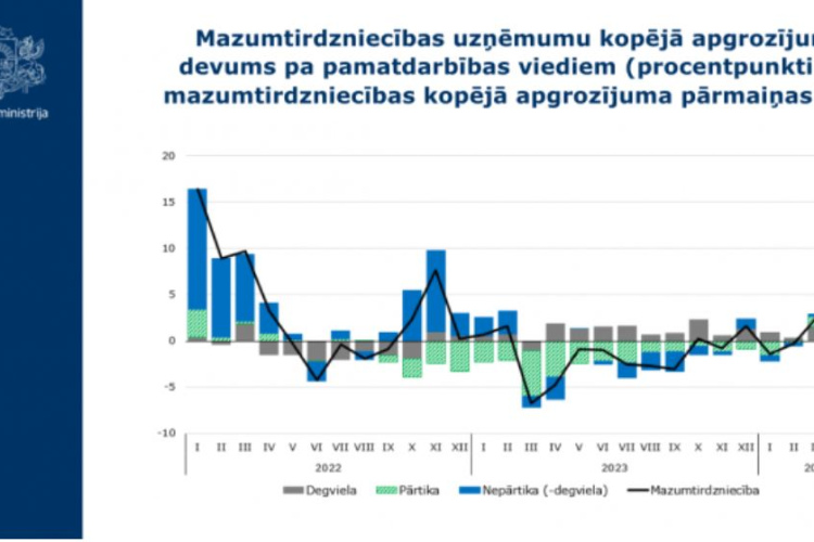Mazumtirdzniecības apgrozījums 2024. maijā, salīdzinot ar iepriekšējo mēnesi, pieauga par 0,3%. Tas nedaudz atsver iepriekšējā mēneša vājo sniegumu, kad bija vērojams samazinājums. Mazumtirdzniecības apgrozījuma sniegums šā gada maijā vērtējams pieticīgi, tomēr mēnešu dati ir diezgan svārstīgi, ko ietekmē virkne faktoru gan no pārdēvēju, gan no patērētāju puses. Lai arī svārstīgie statistikas dati liek uztvert mēneša pieauguma tempus piesardzīgi, arī gada griezumā reģistrēts 1,0% pieaugums.