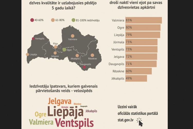 Datu lietotājus informēs par 2022. gadā CSP veiktās iedzīvotāju aptaujas rezultātiem par dzīves kvalitāti deviņās valstspilsētās – Daugavpilī, Jelgavā, Jēkabpilī, Jūrmalā, Liepājā, Ogrē, Rēzeknē, Valmierā un Ventspilī. Šajā aptaujā iegūta informācija par iedzīvotāju apmierinātību ar dažādiem pakalpojumiem, kā izglītība, veselības aizsardzība, pilsētas infrastruktūra – ielas, ceļi, zaļās zonas, sporta un kultūras objekti. Iedzīvotāji pauduši savu viedokli arī par drošības jautājumiem pilsētā, pašvaldību iestāžu darbu un pārvietošanās paradumiem.
