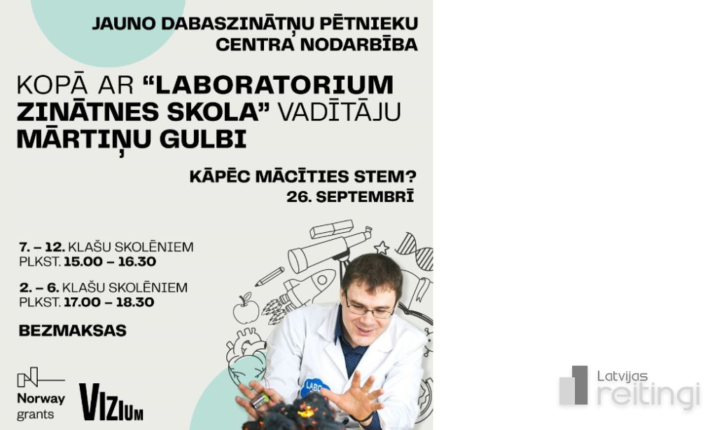 Sākoties jaunajam mācību gadam, atsākas arī Ventspils zinātnes centra VIZIUM Jauno dabaszinātņu pētnieku centra bezmaksas nodarbības, kuru mērķis ir parādīt skolēniem un jauniešiem, ka zinātne var būt interesanta un aizraujoša. Pirmajā nodarbībā kopā ar "Laboratorium Zinātnes skolu" meklēsim atbildes uz jautājumu "Kāpēc mācīties STEM?".