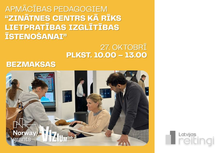 Ventspils zinātnes centrs VIZIUM aicina pedagogus piedalīties bezmaksas apmācībās "Zinātnes centrs kā rīks lietpratības izglītības īstenošanai", kur būs iespēja iepazīties ar zinātnes centra sniegtajām iespējām dažādu mācību tēmu apgūšanai un izveidot savam priekšmetam atbilstošu mācību materiālu sasaistē ar zinātnes centra VIZIUM ekspozīciju.