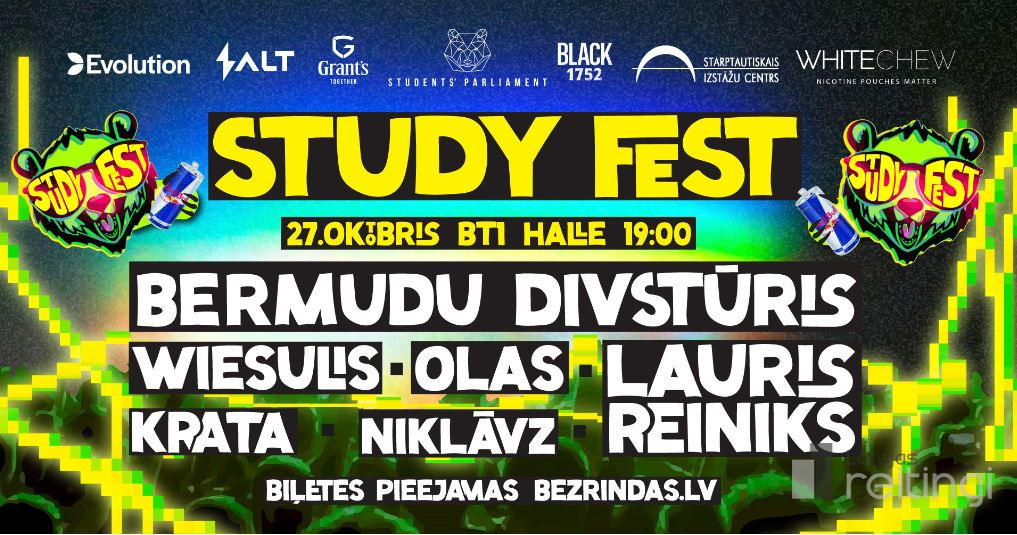 2023. gada 25. oktobrī – Rīgas Tehniskās universitātes (RTU) Studentu parlaments aicina visus Latvijas studentus uz lielāko studentu pasākumu «StudyFest 2023», kurā vienas nakts garumā būs iespējams izbaudīt gan dažādas aktivitātes, gan dibināt studentu dzīvē un nākotnes karjerā vajadzīgus kontaktus, gan arī vienkārši baudīt labu mūziku un uz brīdi atvilkt elpu pēc straujā studiju sākuma. Festivāls notiks piektdien, 27. oktobrī, plkst. 19.00 Starptautiskajā izstāžu centrā Ķīpsalā.