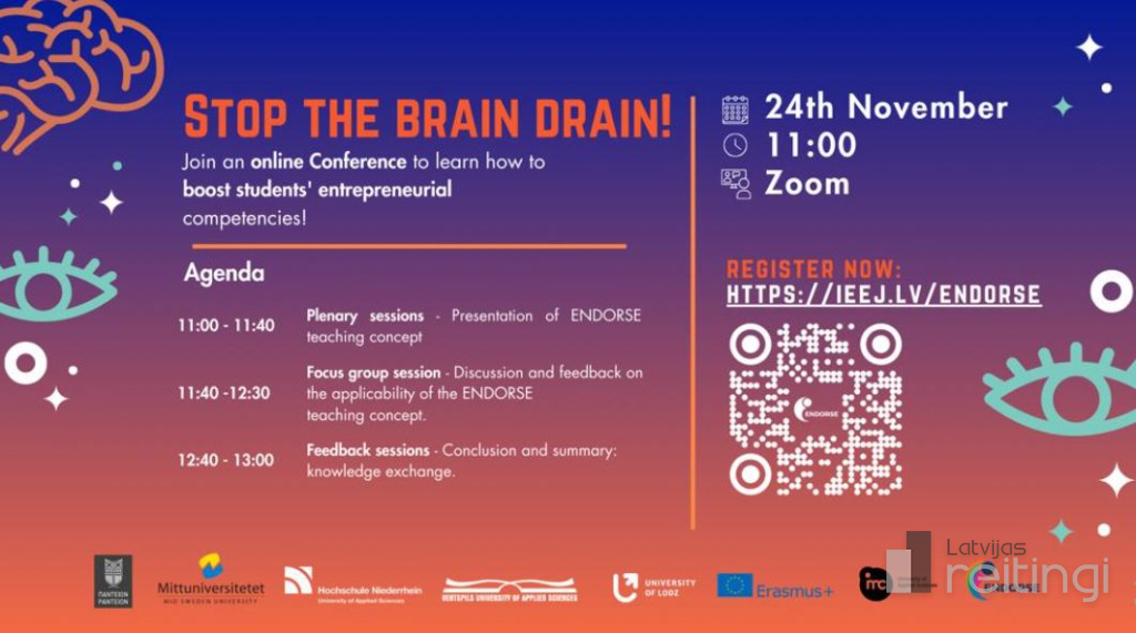 24. novembrī plkst. 11.00 notiks Erasmus+ projekta ENDORSE (Enhancing development of entrepreneurial strategies at university locations affected by brain drain) tiešsaistes konference "Stop the brain drain!", kurā aicināti piedalīties visi Latvijas augstāko izglītības iestāžu docētāji, uzņēmumu un pašvaldību pārstāvji. Konferencē tiks stāstīts par izstrādātajiem mācību materiāliem un studiju kursiem, kas tika radīti, lai veicinātu studentus kļūt par uzņēmējiem.