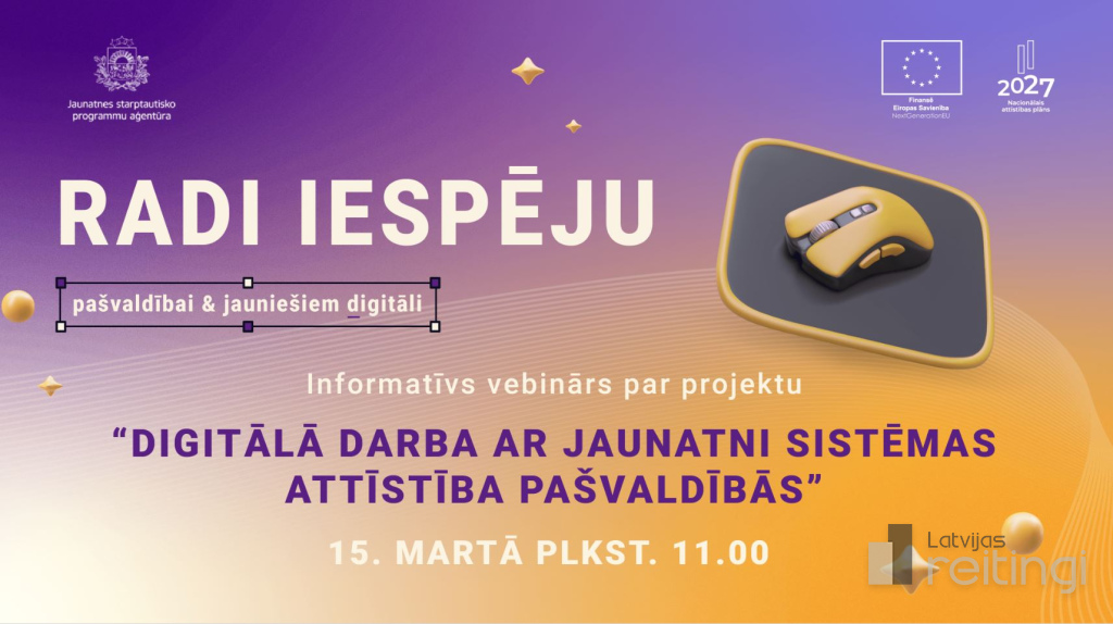 Jaunatnes starptautisko programmu aģentūra (JSPA) līdz šī gada aprīļa vidum aicina pašvaldības pieteikt savas komandas Eiropas Savienības Atveseļošanas fonda finansētajam projektam "Digitālā darba ar jaunatni sistēmas attīstība pašvaldībās". Lai vairāk izskaidrotu pieteikšanās procesu un ieguvumus dalībai projektā, JSPA aicina pašvaldību speciālistus 15. martā plkst. 11.00 piedalīties informatīvā tiešsaistes seminārā.