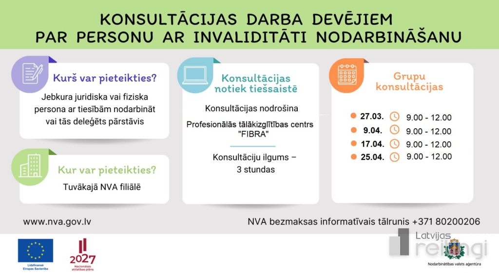 Darba devējiem, kuri nodarbina vai plāno nodarbināt darbiniekus ar invaliditāti, Nodarbinātības valsts aģentūra (NVA) arī martā un aprīlī rīko bezmaksas grupu konsultācijas par personu ar invaliditāti nodarbināšanas jautājumiem. Konsultācijas norisināsies 27. martā, 9. aprīlī, 17. aprīlī un 25. aprīlī no plkst. 9.00 līdz 12.00 tiešsaistē - videokonferenču platformās Zoom vai Team. Konsultācijas šogad sniedz Profesionālās tālākizglītības centra "FIBRA" pasniedzēji NVA īstenotā Eiropas Sociālā fonda (ESF) Plus projekta „Pasākumi iekļaujošai nodarbinātībai" ietvaros.