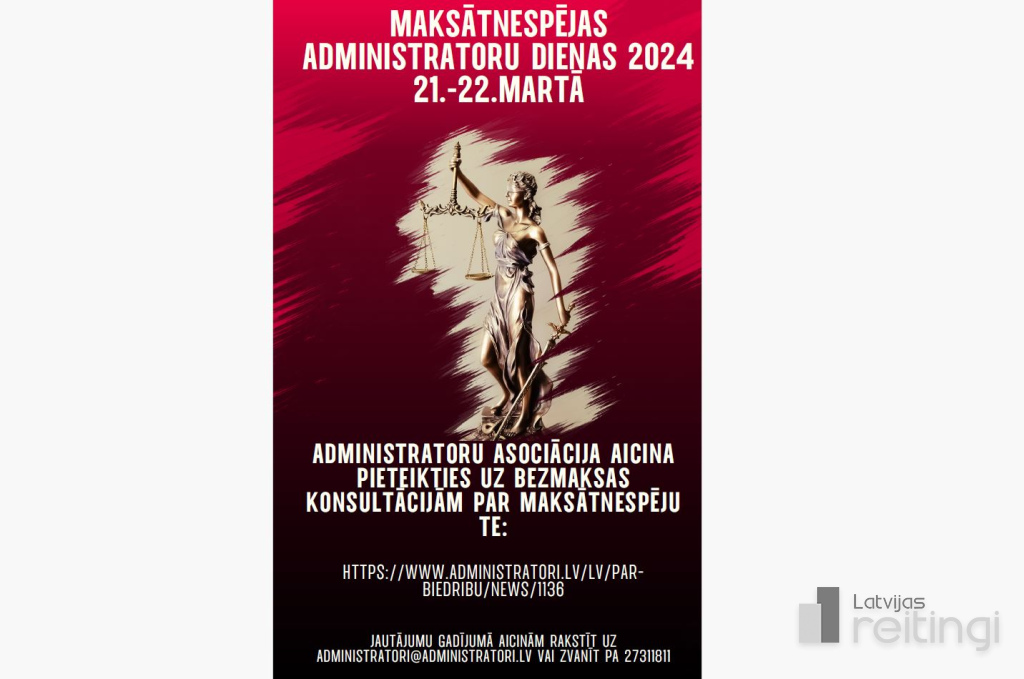 Administratoru asociācijas mājas lapā www.administratori.lv ir pieejams saraksts ar maksātnespējas procesa administratoriem, kuri Maksātnespējas procesa administratoru dienās 2024 sniegs iedzīvotājiem savu profesionālo atbalstu. Administratoru asociācija aicina laicīgi pieteikties pie izvēlētā maksātnespējas procesa administratora, izvēloties no minētā saraksta - https://www.administratori.lv/lv/par-biedribu/news/1136
