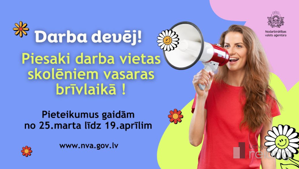 Nodarbinātības valsts aģentūra (NVA) no 25. marta līdz 19. aprīlim pieņem darba devēju pieteikumus skolēnu nodarbinātības pasākuma īstenošanai 2024. gada vasarā. Šogad pieteikumi pasākuma īstenošanai darba devējiem jāiesniedz digitāli – pieteikuma anketu ar skolēniem piedāvāto vakanču aktuālo informāciju aizpildot un iesniedzot NVA CV un vakanču portālā.