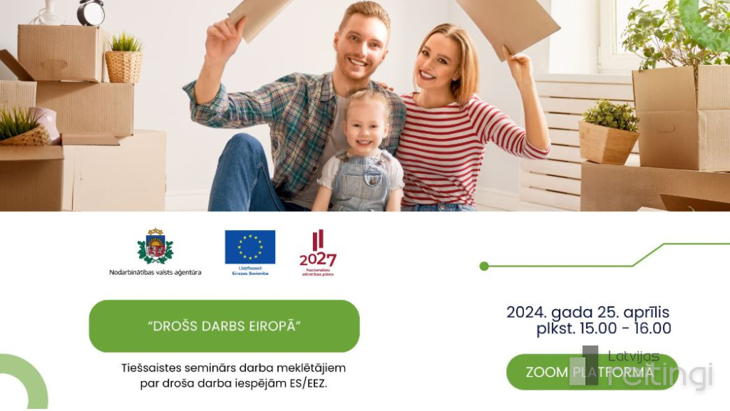 2024. gada 25. aprīlī plkst. 15.00 pēc Latvijas laika videokonferenču platformā Zoom norisināsies Nodarbinātības valsts aģentūras (NVA) Eiropas nodarbinātības dienestu tīkla (EURES) darba mobilitātes konsultantu rīkotais tiešsaistes seminārs "Drošs darbs Eiropā", semināra tēma - "Ģimenes pabalsti, strādājot citā Eiropas Savienības (ES) valstī".