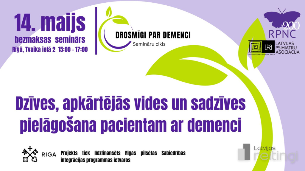 Rīgas psihiatrijas un narkoloģijas centrs (RPNC) kopā ar Latvijas Psihiatru asociāciju ir uzsācis bezmaksas informatīvi izglītojošu semināru ciklu "Drosmīgi par demenci". Cikla otrais seminārs – "Dzīves, apkārtējās vides un sadzīves pielāgošana pacientam ar demenci" notiks 14. maijā plkst. 15.00 – 17.00, Tvaika ielā 2 un to vadīs ergoterapeite Anda Berķe.