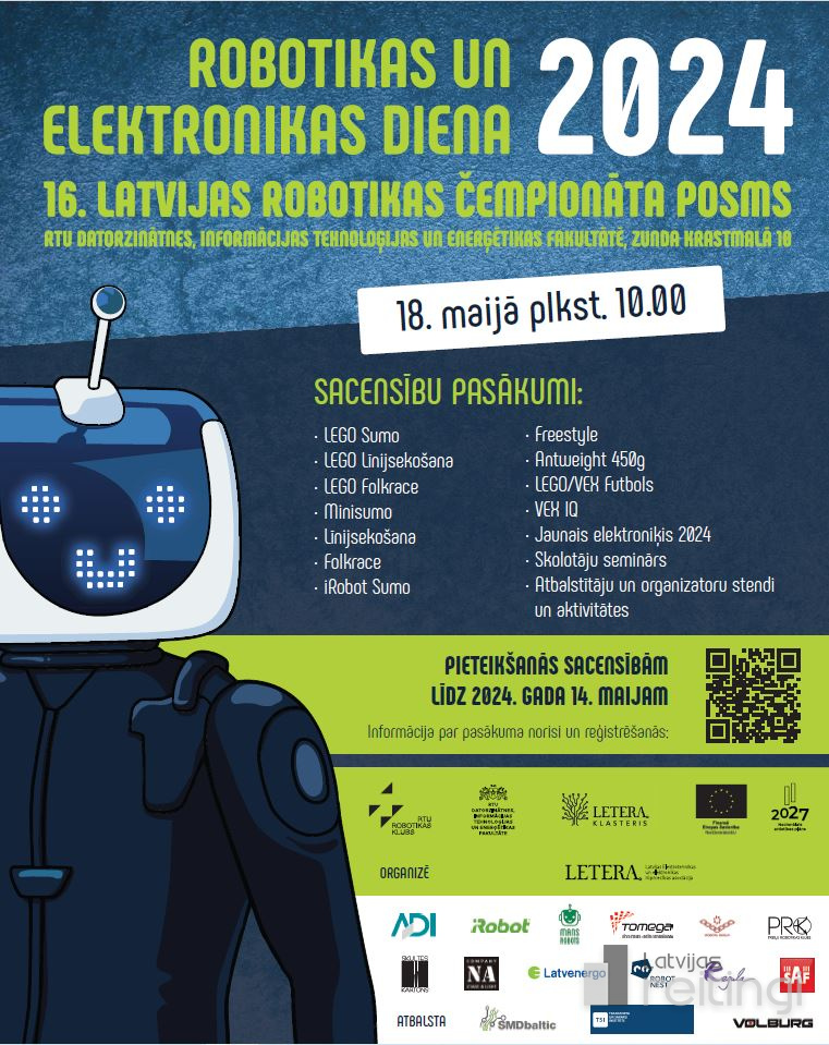 aunie robotikas un elektronikas talanti, demonstrējot savas zināšanas un praktiskās iemaņas, sacentīsies tradicionālajā «Robotikas un elektronikas dienā 2024», kas 18. maijā plkst. 9.00 sāksies Rīgas Tehniskās universitātes (RTU) Datorzinātnes, informācijas tehnoloģijas un enerģētikas fakultātē, Zunda krastmalā 10. Pasākuma laikā norisināsies Robotikas čempionāts, elektronikas konkurss un izglītojoši semināri skolotājiem. Dalība sacensībās un pasākuma apmeklēšana ir bez maksas.