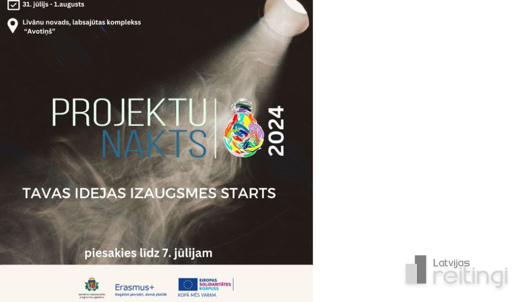 Jaunatnes starptautisko programmu aģentūra (JSPA) pagarina pieteikšanā termiņu pasākumam "Projektu nakts 2024" līdz 7. jūlijam. Pasākums norisināsies 31. jūlijā un 1. augustā Latvijas jauniešu galvaspilsētas 2024 – Līvānu tuvumā. Diennakts garumā kopā ar pieredzējušiem ekspertiem un vienaudžiem dalībnieki varēs attīstīt projektu rakstīšanas prasmes, strādājot pie savām idejām un izzinot iespējas finansējuma piesaistei to īstenošanai. Šis pasākums būs lielisks vasaras piedzīvojums, kur neformālā gaisotnē dalībnieki pilnveidos prasmes, iegūs jaunu pieredzi un domubiedrus!
