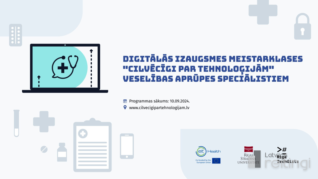 Līdz 10. septembrim iespējams pieteikties biedrības Riga TechGirls veidotajām bezmaksas apmācībām "Cilvēcīgi par tehnoloģijām", kuras tiek organizētas sadarbībā ar Rīgas Stradiņa universitāti (RSU), lai veicinātu veselības aprūpes speciālistu digitālo prasmju attīstību. Tehnoloģiju apguves programma paredzēta ikvienam medicīnas darbiniekam un tiem, kas savu nākotni vēlētos saistīt ar šo nozari. Bezmaksas apmācības norisināsies 3 mēnešus, kuru laikā 24 tiešsaistes teorētiskajās un četrās praktiskajās nodarbībās būs iespējams uzlabot zināšanas par dažādu rīku un tehnoloģiju lietošanu veselības aprūpē un iegūt prasmes, kuras noderēs arī ikdienā.