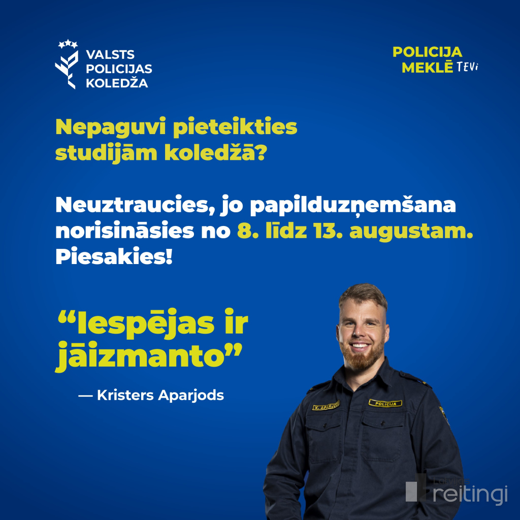 Ņemot vērā aizvien esošo pretendentu interesi par iespēju uzsākt mācības Valsts policijas koledžā, izsludinām reflektantu papilduzņemšanu arodizglītības un īsā cikla profesionālās augstākās izglītības programmās "Policijas darbs". Laikā no 8. līdz 13. augustam aicinām personas ar iepriekš iegūtu vismaz vidējo izglītību iesniegt dokumentus uzņemšanai mācībām Valsts policijas koledžā.