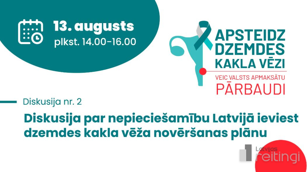 Šodien, 13. augustā, no plkst.14 līdz plkst.16 notiks atklāta tiešsaistes diskusija par iespējām novērst cilvēka papilomas vīrusa izraisītu vēžu izplatību, par nepieciešamību Latvijā ieviest dzemdes kakla vēža novēršanas plānu un reālām iespējām sasniegt šāda plāna mērķi. Diskusija būs tiešraidē, kas būs publiski pieejama jebkuram interesentam.