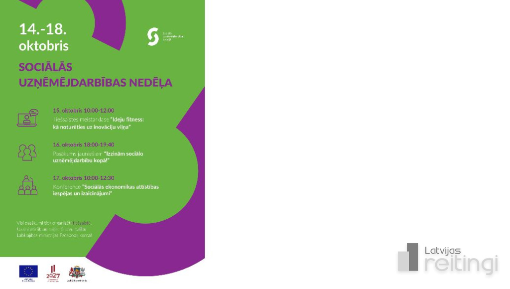Sociālās uzņēmējdarbības nedēļas pasākumi tiek rīkoti ar Eiropas Sociālā fonda Plus projekta “Atbalsts sociālajai uzņēmējdarbībai” finansiālo atbalstu.