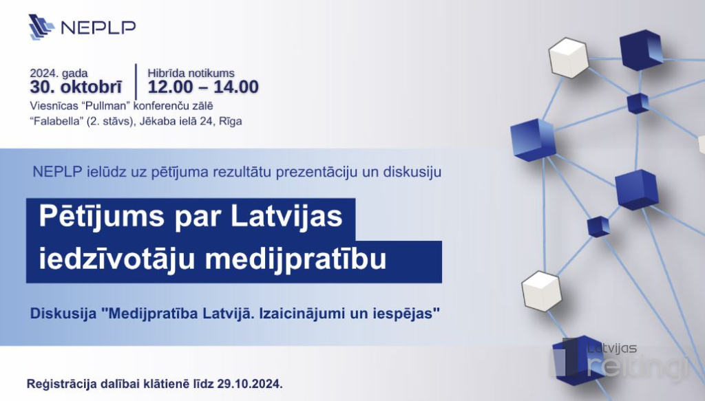 NEPLP aicina ikvienu interesentu uz pētījuma "Par Latvijas iedzīvotāju medijpratību" prezentāciju un diskusiju, kas notiks 2024. gada 30. oktobrī, trešdien, no plkst. 12.00 līdz 14.00 viesnīcas "Pullman" konferenču zālē "Falabella" (2. stāvā), Jēkaba ielā 24, Rīgā.