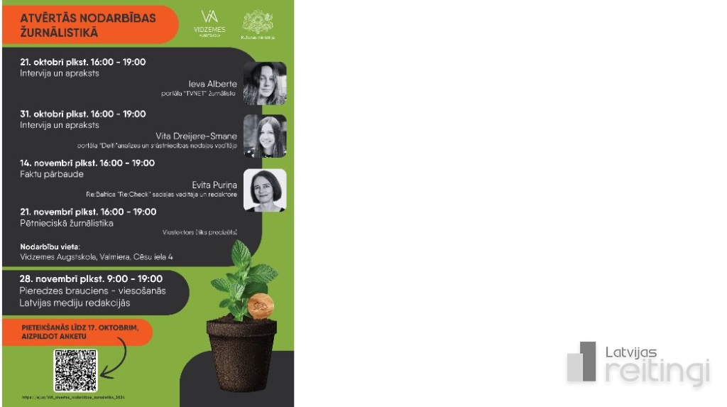 Pirmā nodarbība notiks 21. oktobrī plkst. 16.00 Vidzemes Augstskolā, Valmierā, Cēsu ielā 4. Nodarbībām var pieteikties mediju studiju un žurnālistikas studenti, kā arī vidusskolēni, kuriem ir interese par žurnālistikas studijām. Aktīvākie darbnīcu apmeklētāji nodarbību cikla noslēgumā apmeklēs arī vairākas mediju redakcijas, lai klātienē pieredzētu, kā notiek žurnālistu darbs ikdienā. Pieteikties darbnīcām iespējams līdz 17. oktobrim, aizpildot anketu un norādot, kuras no darbnīcām vēlēsies apmeklēt: https://ej.uz/ViA_atvertas_nodarbibas_zurnalistika_2024