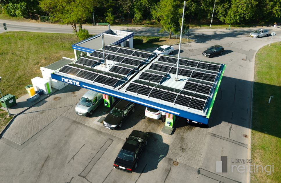 Latvijā vadošais degvielas tirgotājs Neste ar saules paneļu uzstādīšanu uz Neste DUS Rīgā, Lielirbes ielā jumta, uzsāk sava tīkla DUS aprīkošanu ar saules enerģijas spēkstacijām. Plānots, ka uzstādītie 44 saules paneļi gada laikā saražos ap 17 tūkstošiem kWh, tādējādi daļēji nosedzot degvielas uzpildes stacijas pašpatēriņu. Pirmās stacijas aprīkošanā investēti ap 20 tūkstošiem eiro.