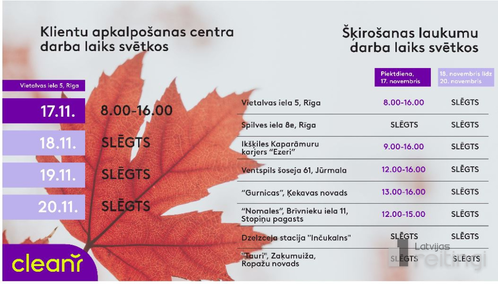 Ņemot vērā, ka 18. novembris, Latvijas Republikas 105. proklamēšanas gadadiena, iekrīt sestdienā, nākamā darba diena tiek noteikta kā brīvdiena. Tādējādi pirmdien, 20. novembrī, arī "CleanR" klientu centrā un šķirošanas laukumos iedzīvotāju apkalpošana klātienē netiks nodrošināta. Savukārt pirmssvētku dienā, 17. novembrī, atvērti būs pieci šķirošanas laukumi, bet to darba laiks tiks mainīts.