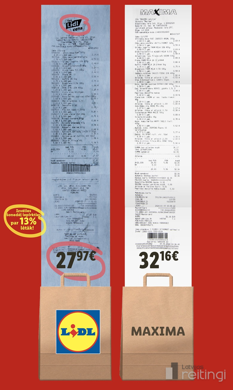 Kā apliecina jaunākais produktu cenu salīdzinājums, "Lidl" cenas ir par 13% zemākas nekā "Maxima" piedāvātās.