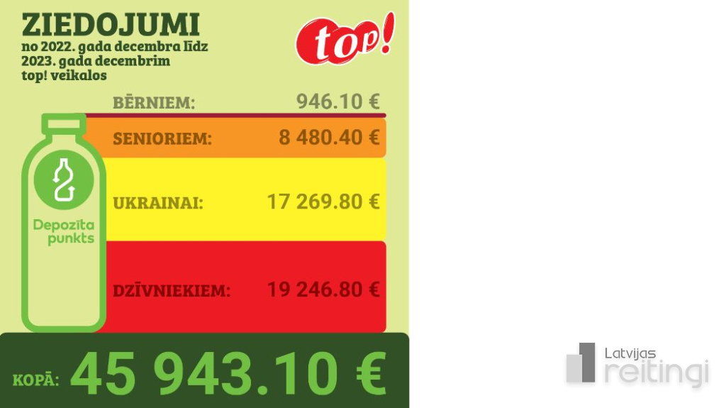 Februāra sākumā apritēja divi gadi kopš Latvijā darbojas depozīta sistēma, un veikalu tīkla top! dati iezīmē pārliecinošu tendenci – iedzīvotāju vidū aizvien populārāka kļūst taras nodošana. 2023. gadā top! depozīta punktos Latvijas reģionos savākts vairāk nekā 35 miljoni taras vienību, savukārt klientu veiktie ziedojumi dzīvniekiem, bērniem un senioriem, kā arī Ukrainas atbalstam top! depozīta punktos sasniedz gandrīz 46 tūkstošus eiro gada laikā. Lepojamies arī ar Depozīta Iepakojuma Operatora piešķirto augstāko vērtējumu martā veikalu tīklu kategorijā, kur darbojas vidējie depozīta punkti!