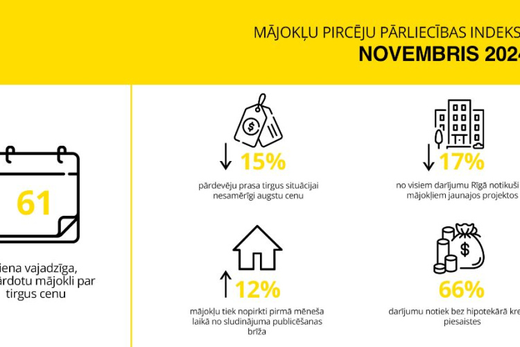 Gada nogalē mājokļu tirgus kļuvis manāmi aktīvāks, liekot pircējiem lēmumus pieņemt ātrāk, secināts jaunākajā "Latio" Mājokļu pircēju pārliecības indeksā. Pēdējo mēnešu laikā kopējais darījumu skaits Latvijā audzis par aptuveni 15%, savukārt darījumi ar hipotekārajiem kredītiem par 7% vairāk. Daļu statistikas veido darījumi, kas sākti gada sākumā un noslēgušies vien tagad. Līdz ar trešo EURIBOR likmes samazinājumu, sabiedrībai signalizējot par inflācijas augstākā punkta pārvarēšanu, pakāpeniski samazinās arī mājokļa pārdošanai nepieciešamais laiks. Analizējot mājokļu tirgus tendences gada griezumā, "Latio" eksperti fiksējuši paradoksu; lai gan valstī būtiski pieaug viena cilvēka mājsaimniecību skaits, vienlaikus Latvijas ir ES līdere pēc to iedzīvotāju īpatsvara, kuri spiesti dzīvot pārpildītos mājokļos.